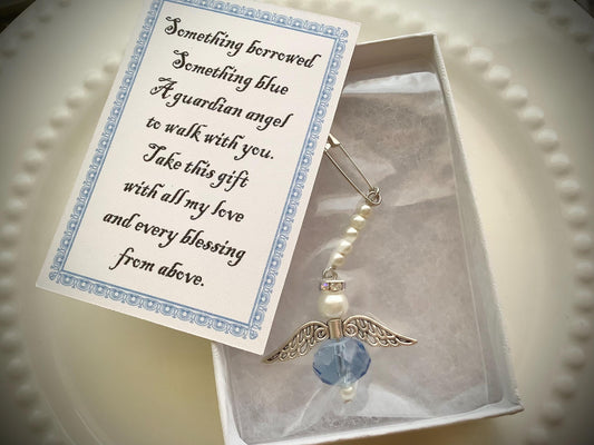 An Angel for the Bride, Something Blue, Wedding Bouquet Charm w/Card Wedding Dress Angel, Guardian Angel, Glass Pearls, Angel for bride pin