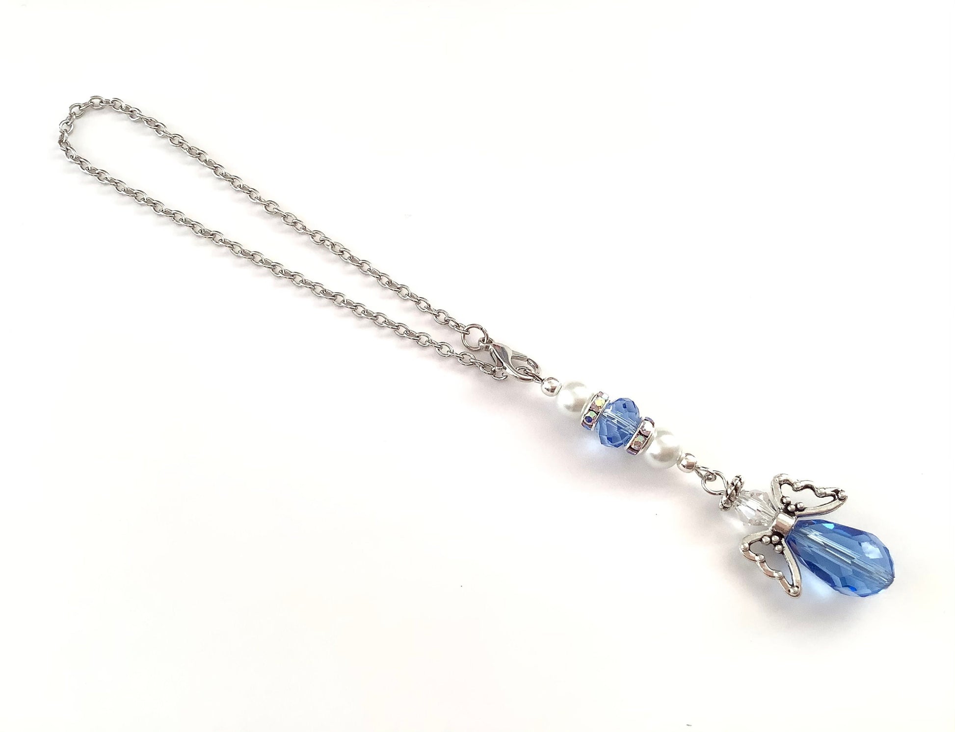 Blue glass crystal angel with glass pearl beads and sparkling silver-tone components. Handmade with much love in the USA Chain with clasp.