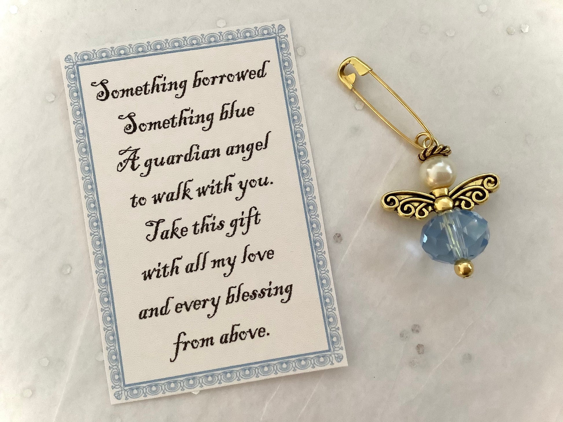 Something blue bridal bouquet charms, garter charms. Handmade with much love and care. A meaningful gift to be treasured for the bride on her wedding day. Tiny hand-beaded sparkling blue glass angel for bridal bouquets, wedding dresses, garters, and more!