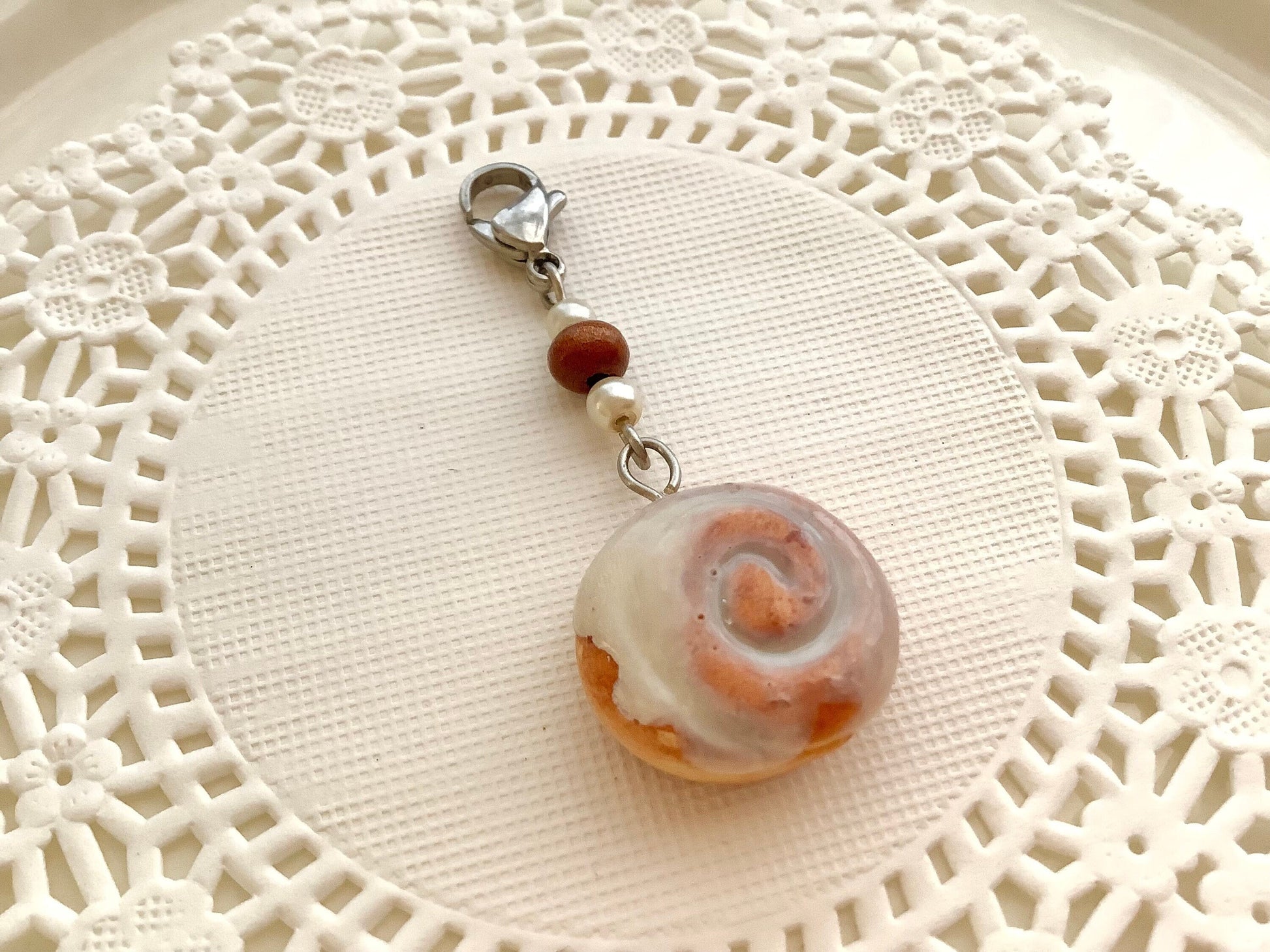 Tiny cinnamon roll with buttercream icing charm.