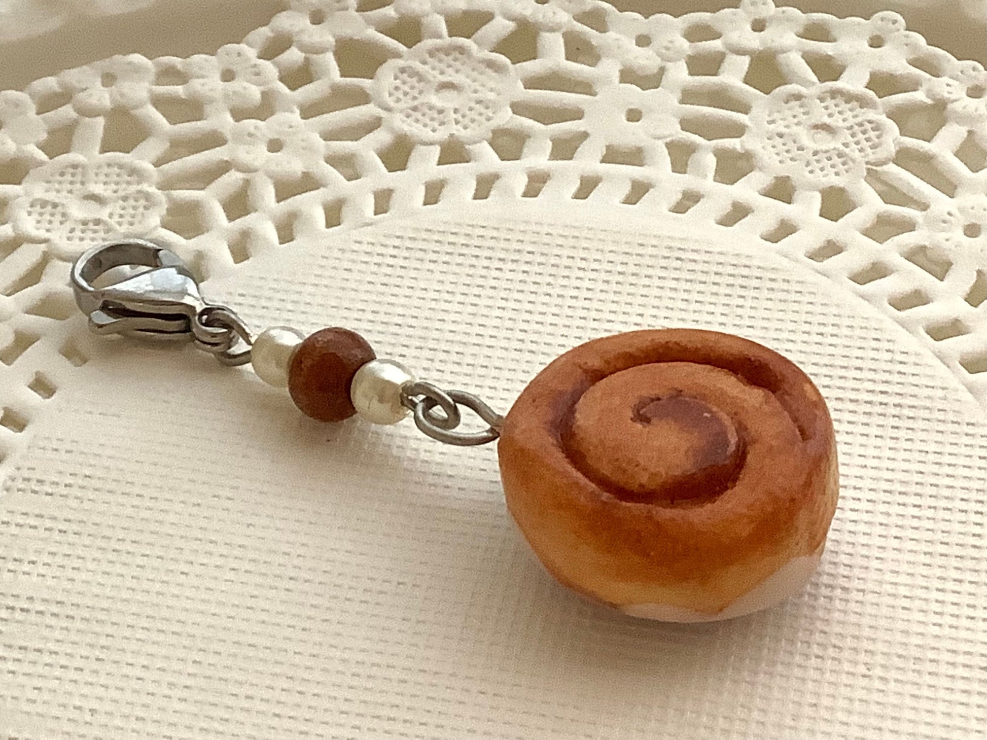 Affixed to a stainless steel lobster claw. Entire length of charm from top of clasp to bottom of cinnamon bun is 5 centimeters.