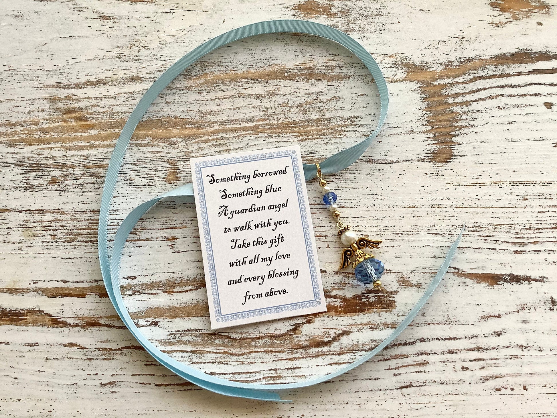 Crystal wedding angel satin ribbon, Blue Glass, Bouquet Angel w/Card Wedding Dress Angel, Guardian Angel Bridal Shower, Angel on Blue Ribbon