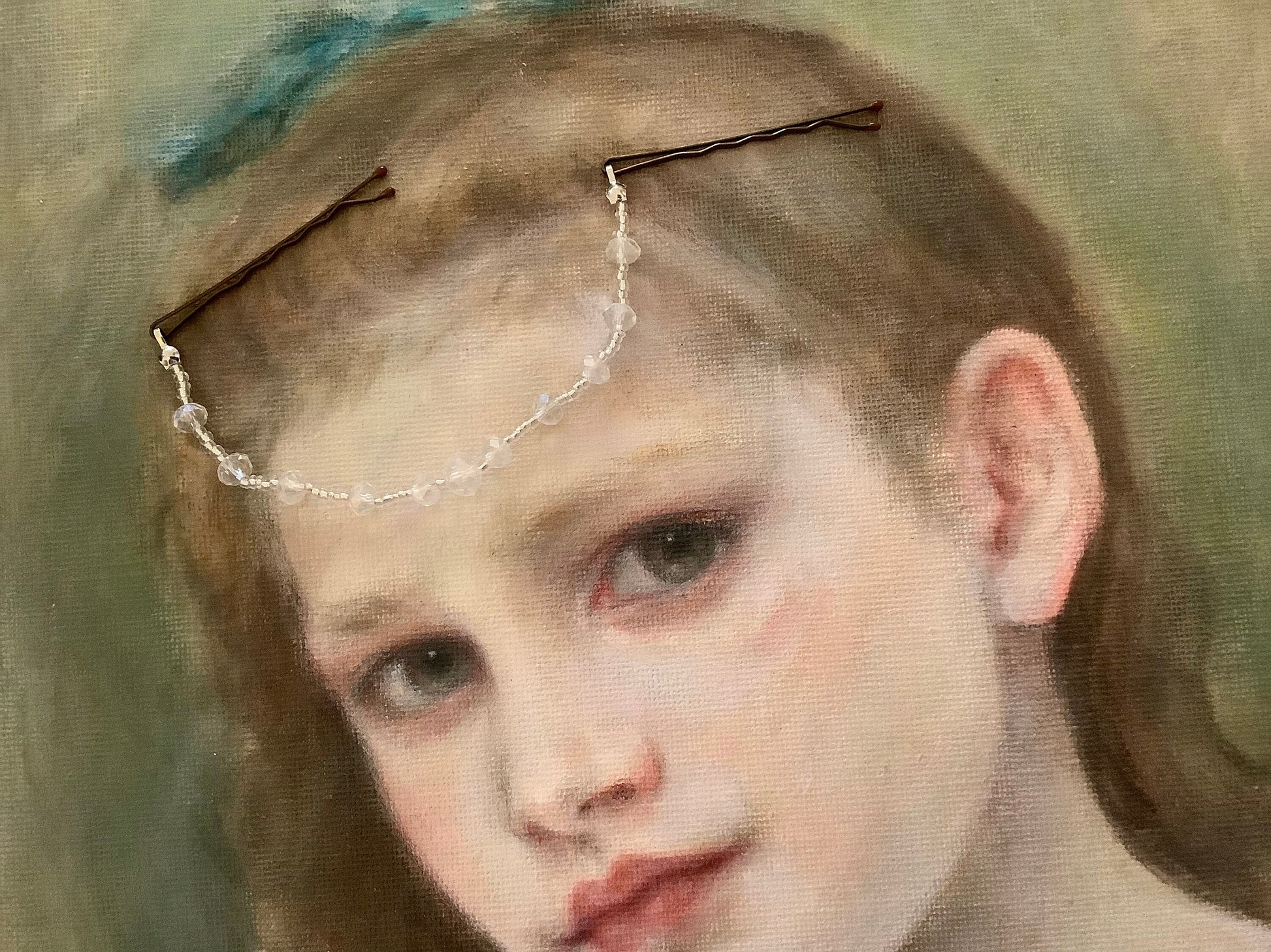 Can be positioned over many beautiful hairstyles, worn to pull long hair back or worn as a tiara.
