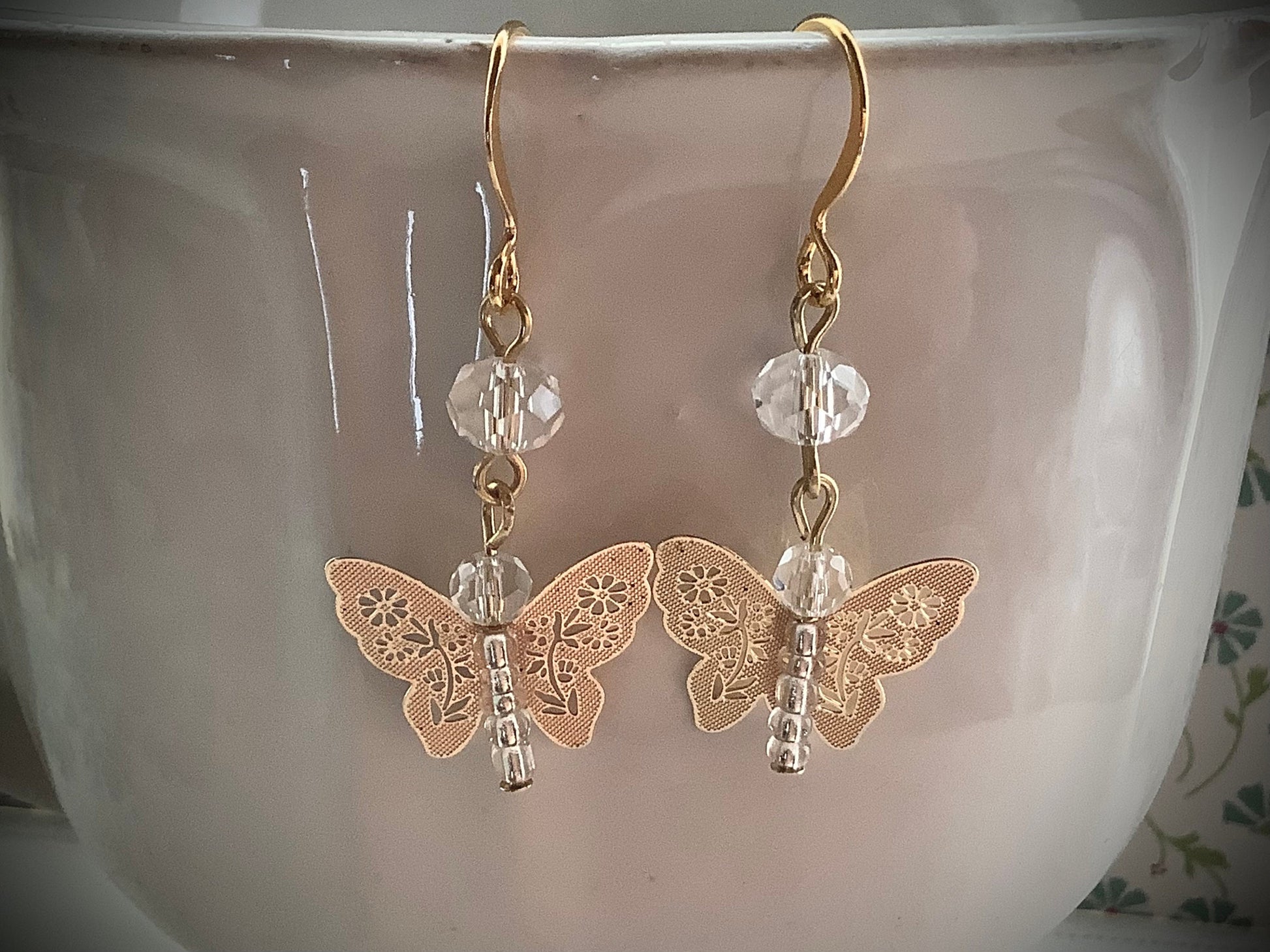 Filigree dainty floral lace look butterfly earrings hand beaded with tiny glass beads and clear glass crystals. Affixed to gold plated stainless steel hooks.