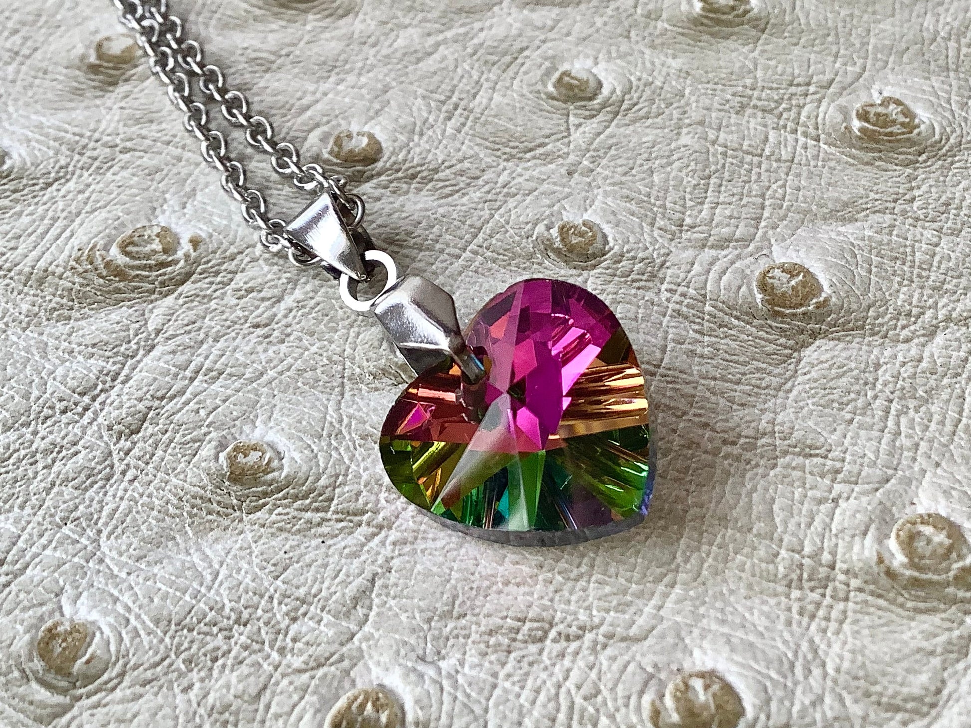 This dazzling Vitrail rainbow crystal heart sparkles with so many gorgeous colors. This beautiful crystal is attached to an 18 inch hypoallergenic stainless steel chain with easy on and off lobster claw clasp.
