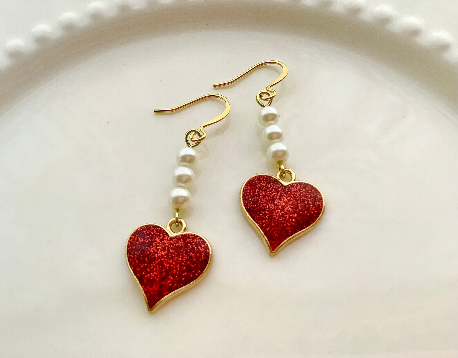 Red glitter heart earrings with tiny glass pearls and gold plated stainless steel hooks.