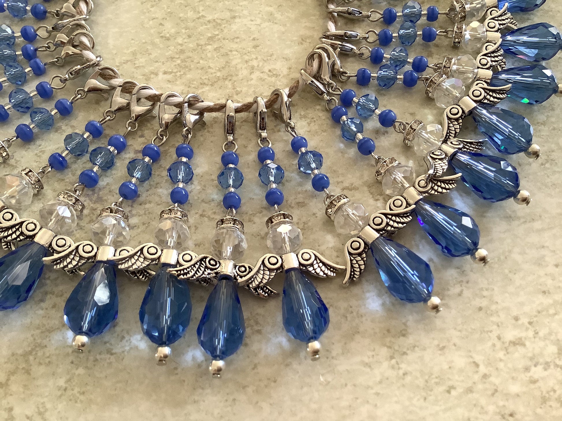 This sweet handmade angel is comprised of a beautiful blue glass crystal bead, Tibetan silver wings and sparkling rhinestone crown, metal and shimmering glass beads. Each tiny sparkling angel is affixed to a small silver-tone lobster clasp for easy attachment to whatever she wishes.
