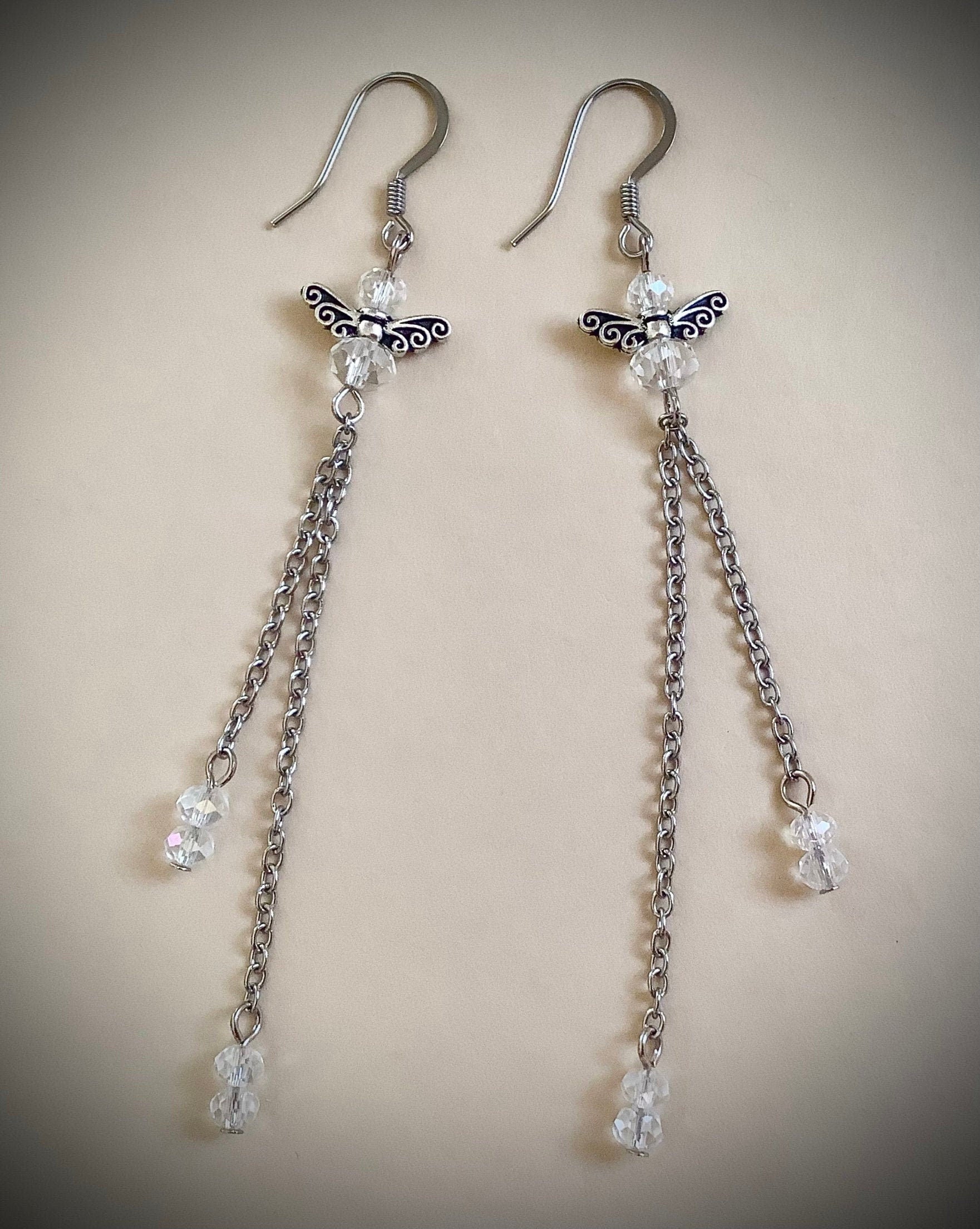 Angel earrings, Fairy earrings, long dangle chain earrings, angel wing earrings, crystal dangle earrings, long earrings, fantasy, magical