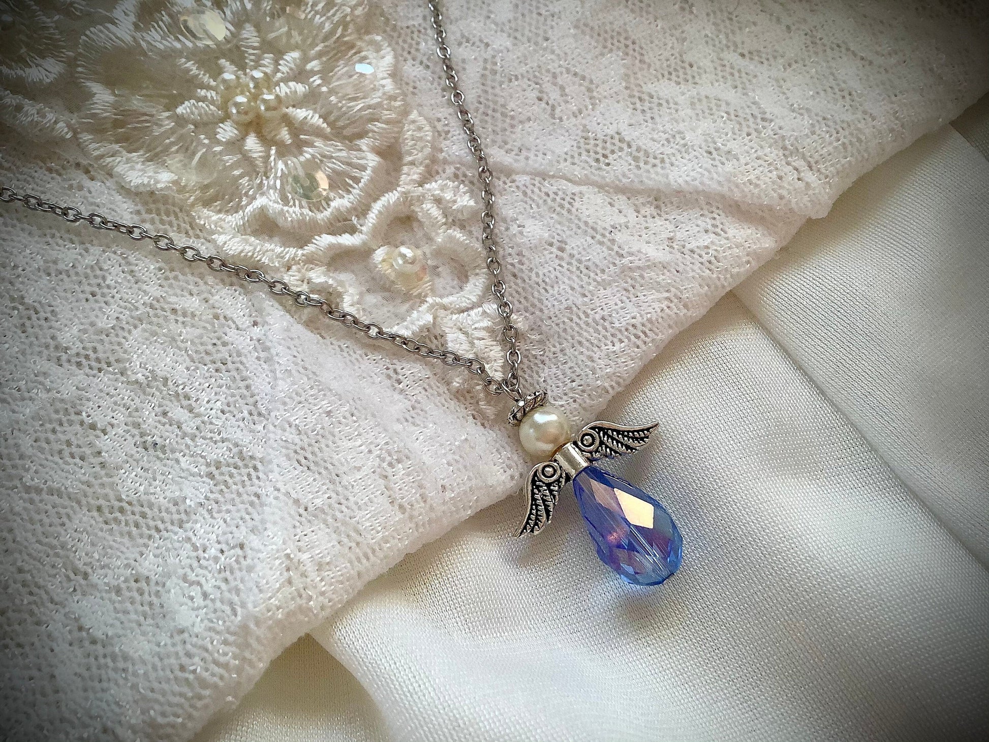 Angel for the bride necklace, blue bridal necklace, blue crystal necklace, blue pendant, crystal necklace, angel charm necklace, glass pearl