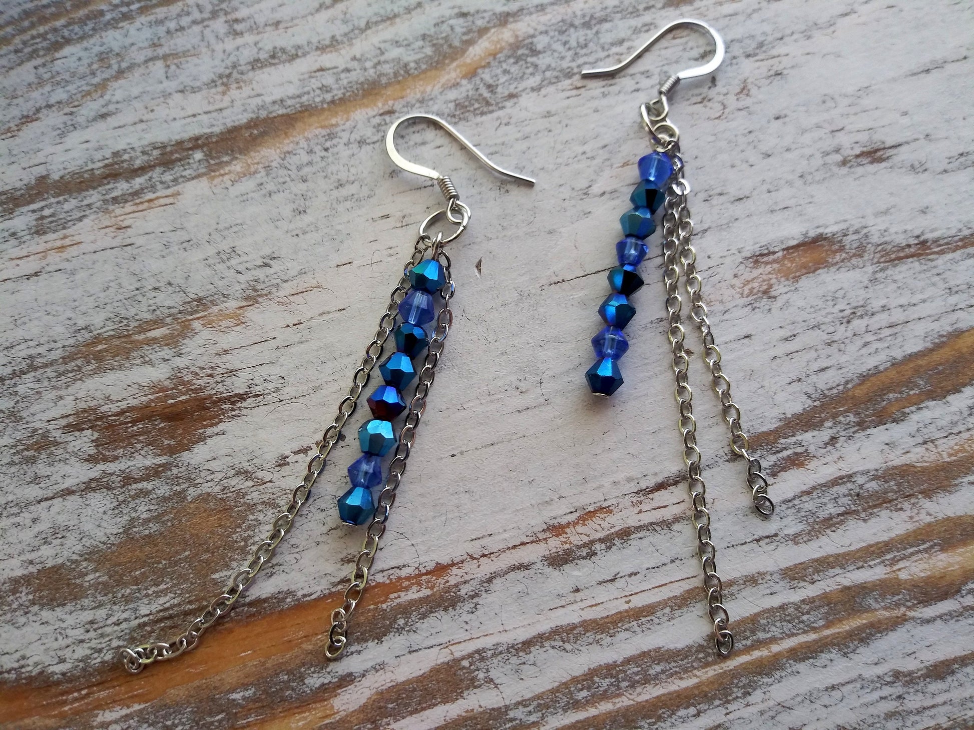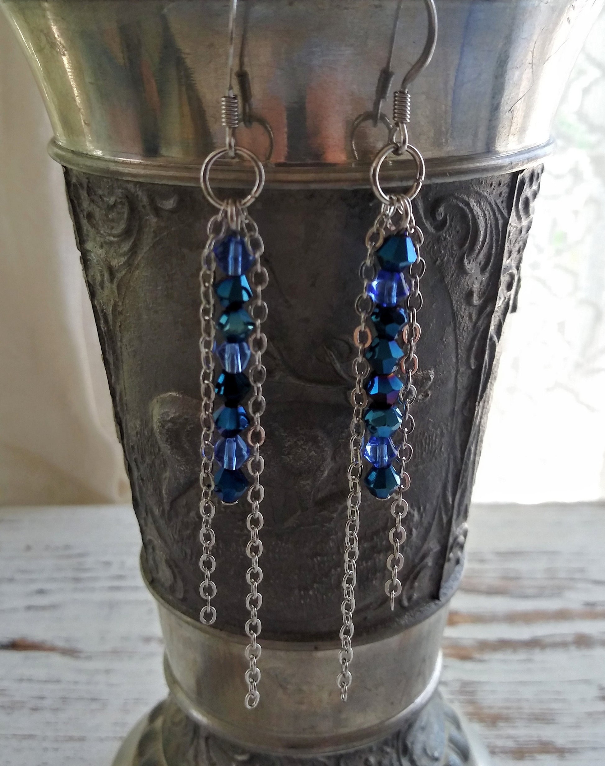 Blue Dangle Earrings / Long Chain Earrings / Blue Glass Crystals / Silver Chain / Boho Earrings / Stainless Steel Hooks