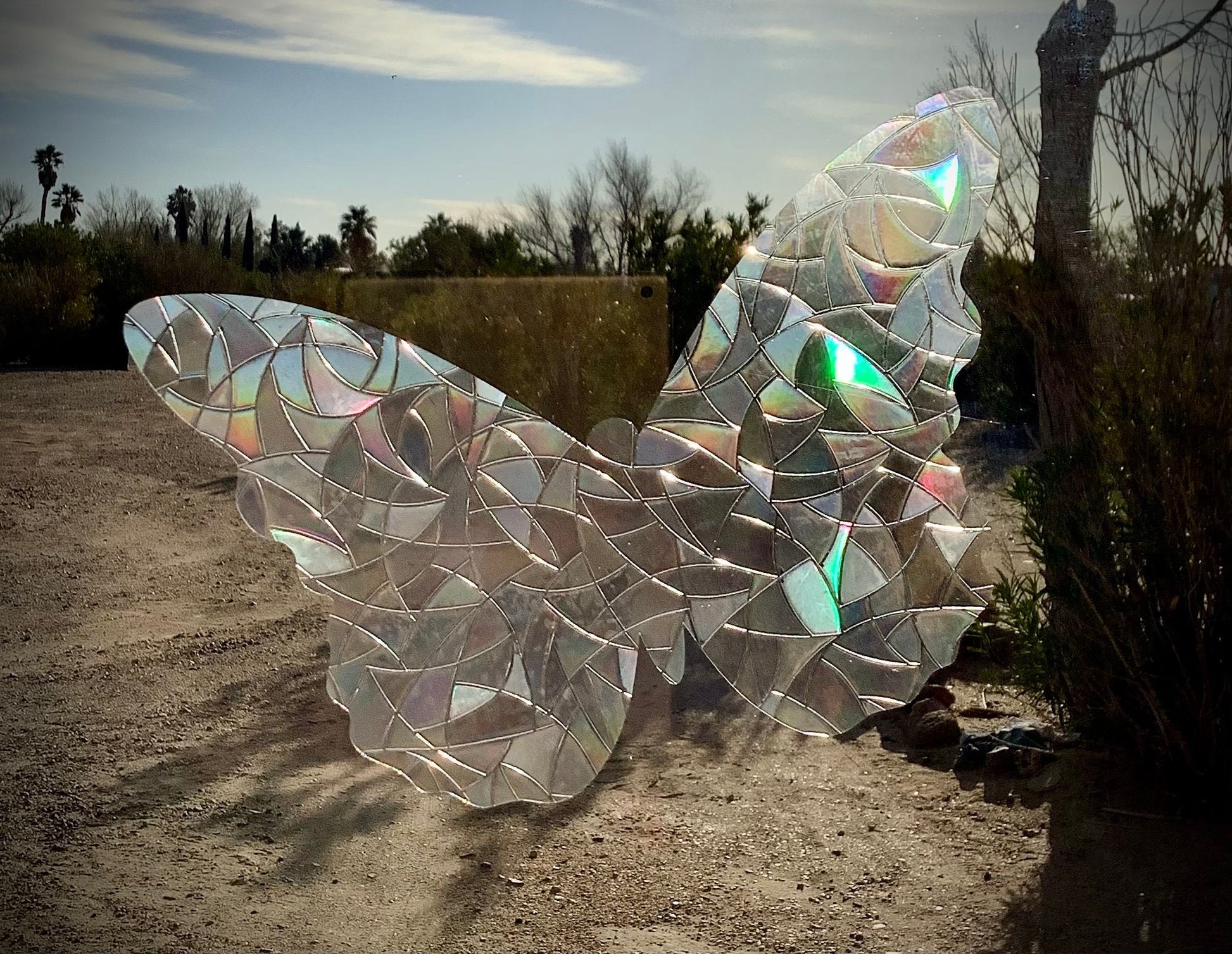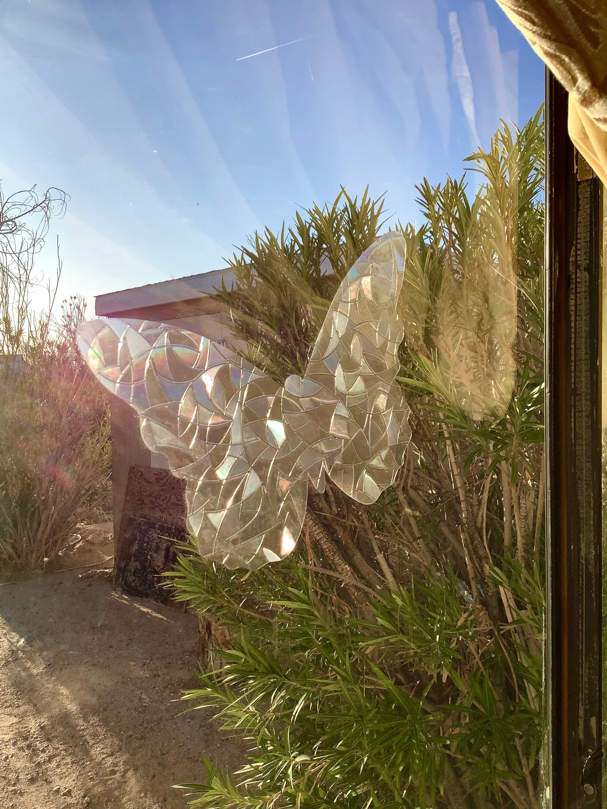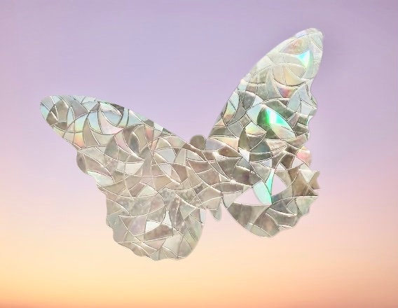 On cloudy days this butterfly appears more like textured/frosted glass with less rainbow effect still gracing windows with its lovely cutout design.