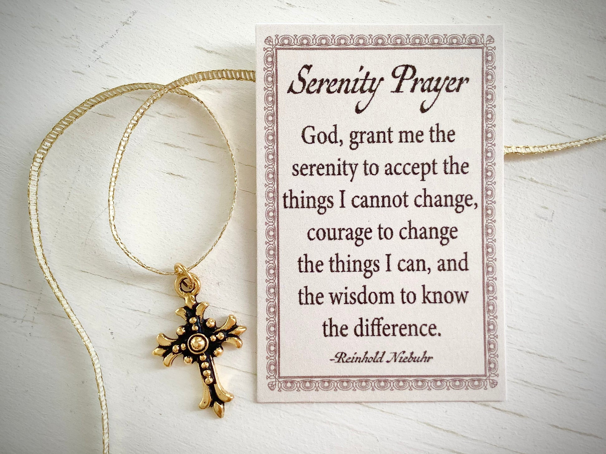 Small fine gold plated cross attached to a shimmering gold ribbon with included Serenity prayer card as shown.
