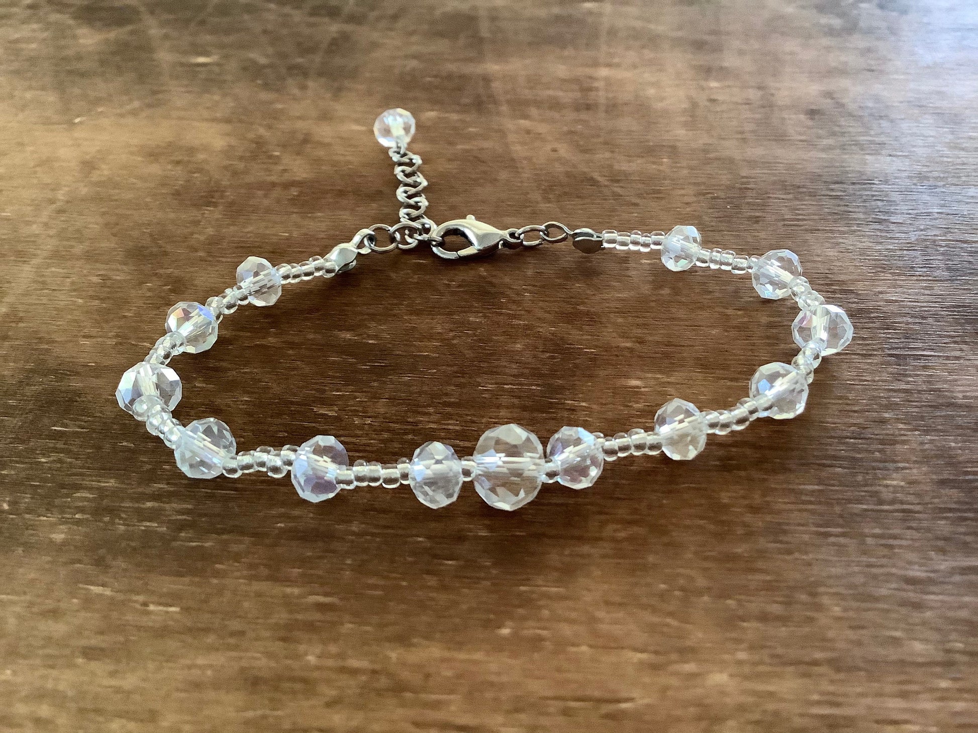 Sparkling hand-strung crystals and tiny silver foil lined glass beads.