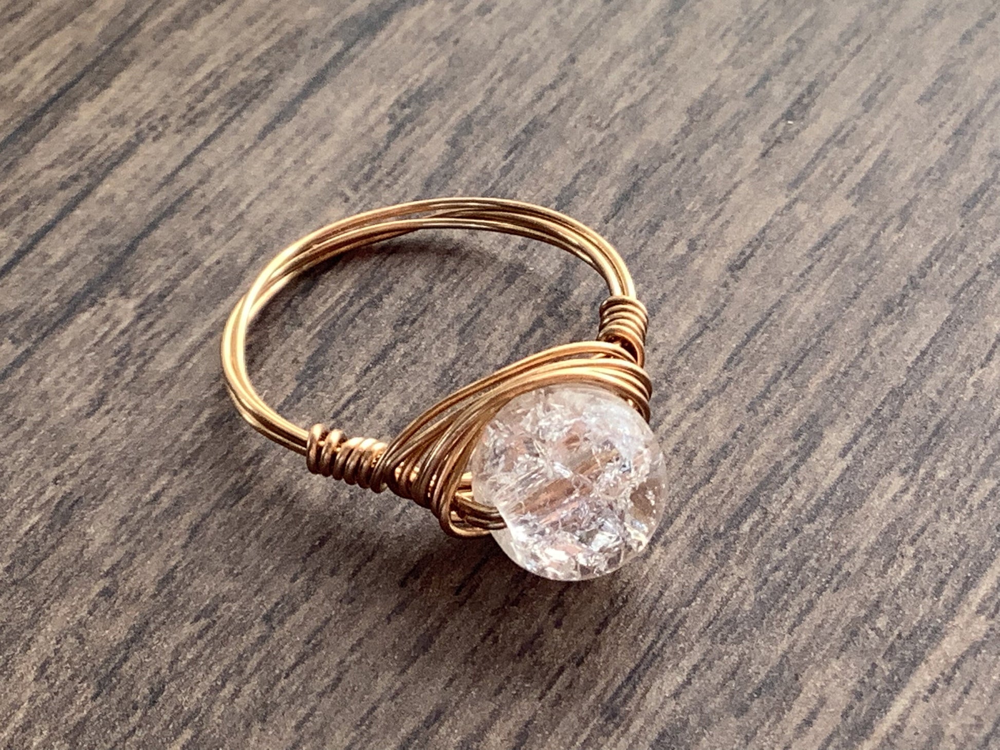Crystal Ring - Dainty Crackle Glass Crystal Wire Wrapped Ring Gold Tarnish Resistant Brass Wire - Delicate Crystal Ring