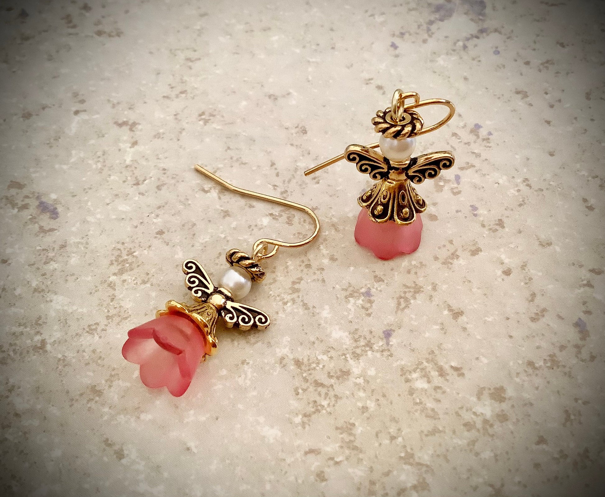 Flower girl earrings, flower fairy angel earrings, pink angel earrings, antique gold, gold plated steel hooks, angel earrings, women & girls