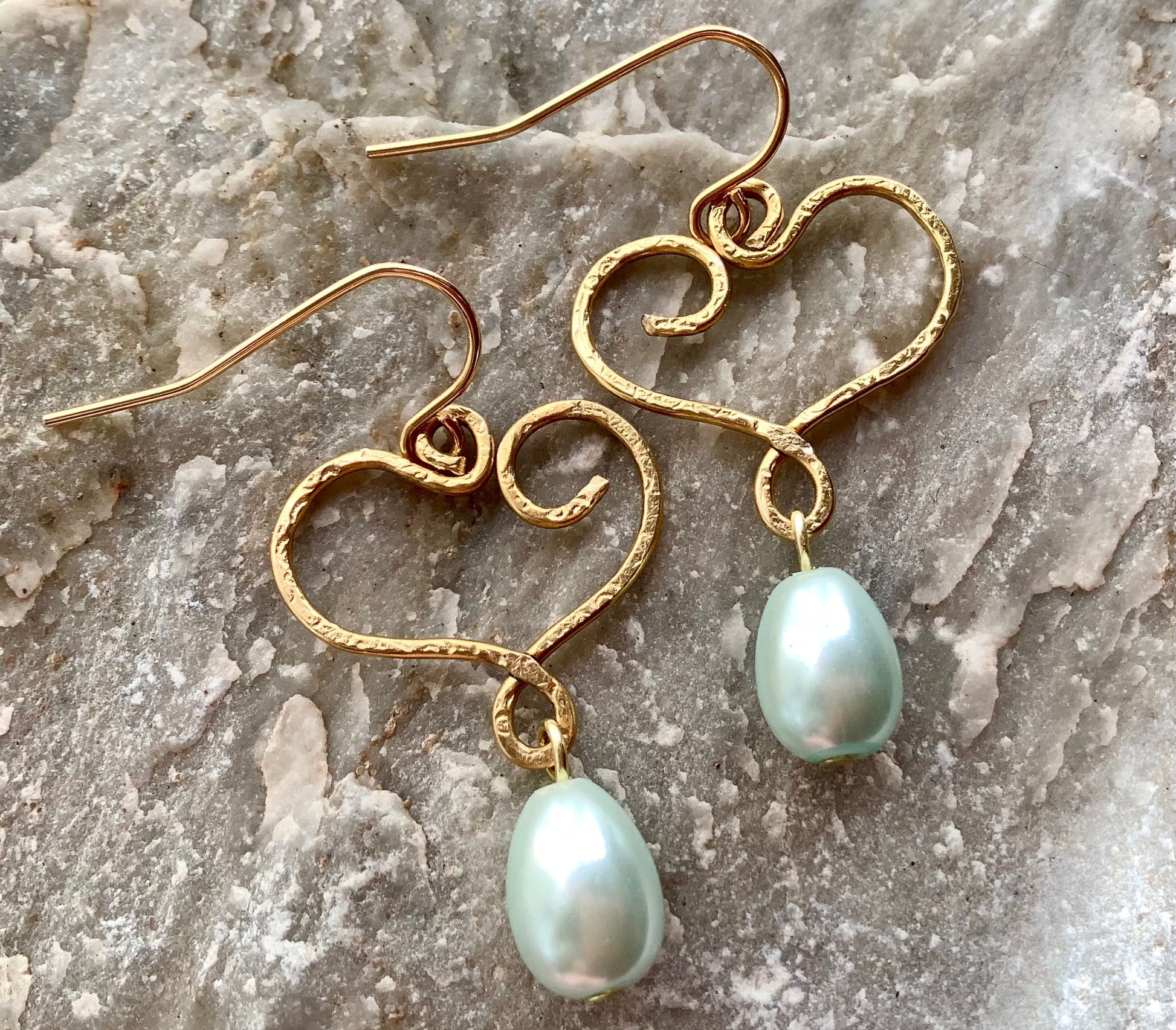 Hammered golden copper wire heart drop earrings with light powder blue colored glass pearls.