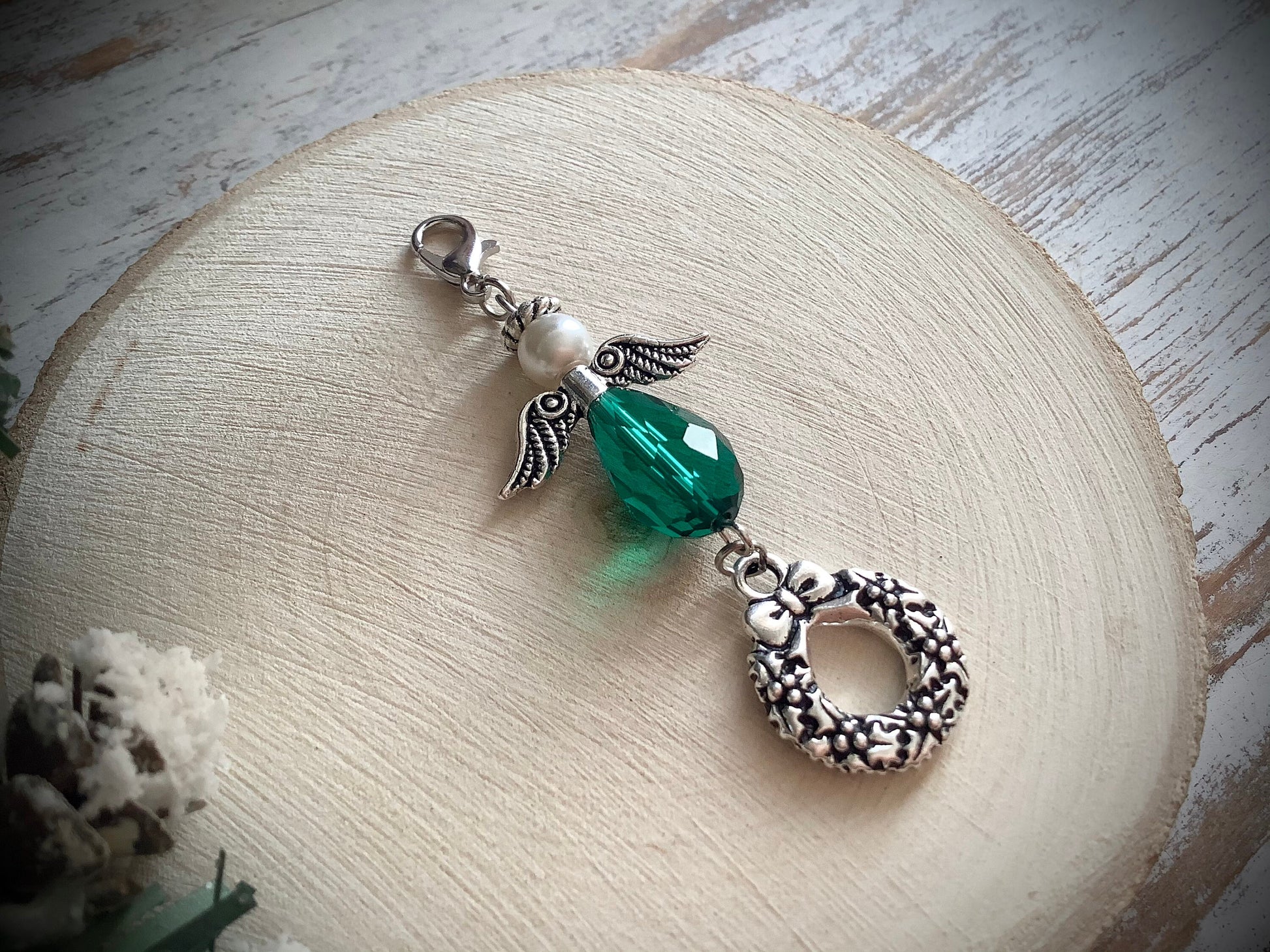 Holiday Angel Charm - Merry Christmas Charm - Bouquet Charm - Merry Christmas From Heaven - Angel with Wreath Charm - Green Crystal Angel