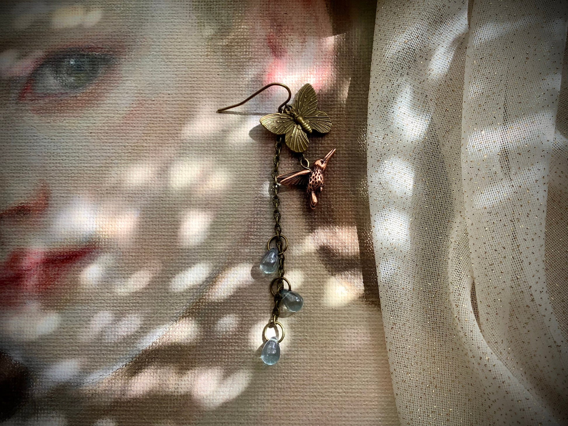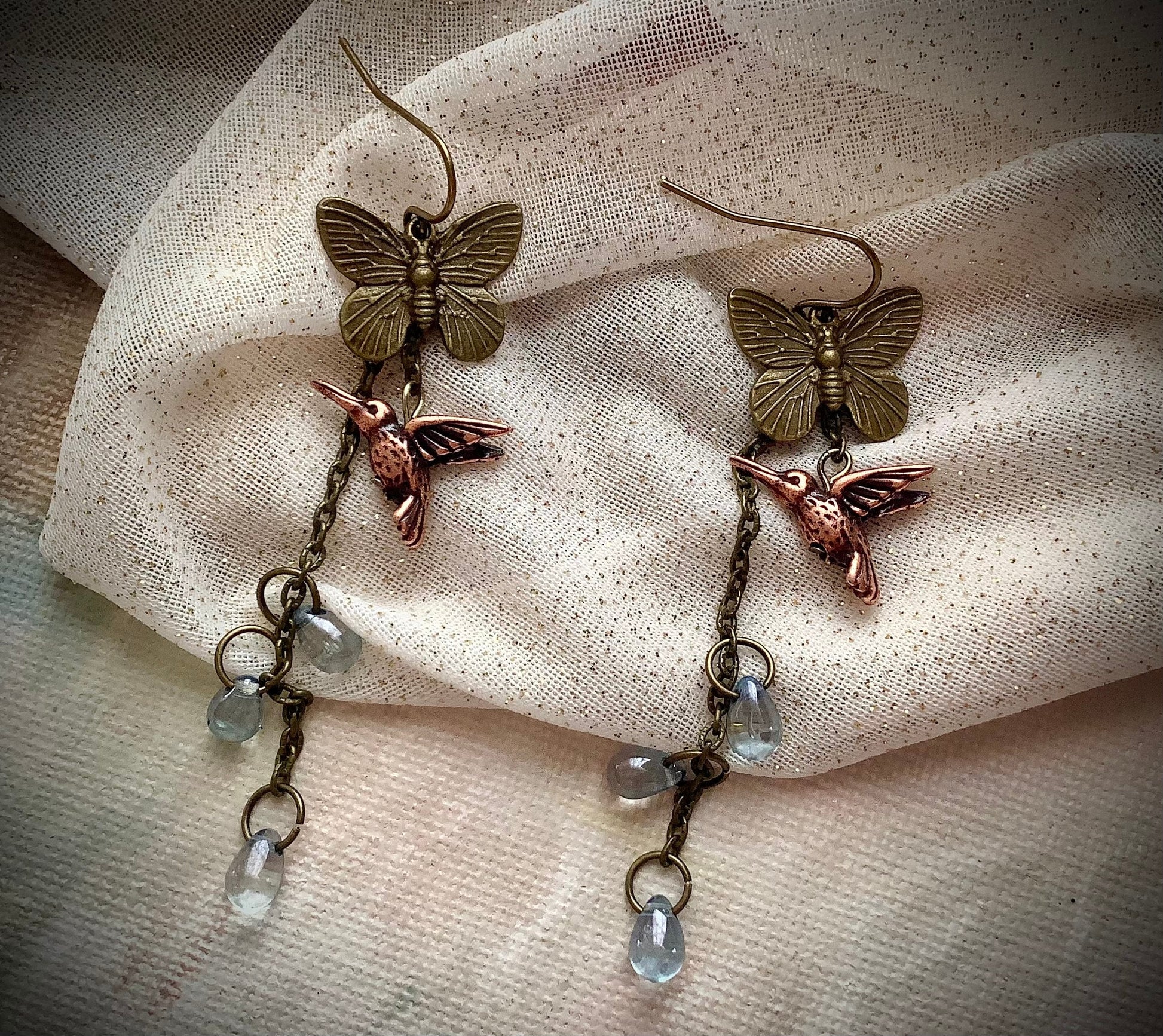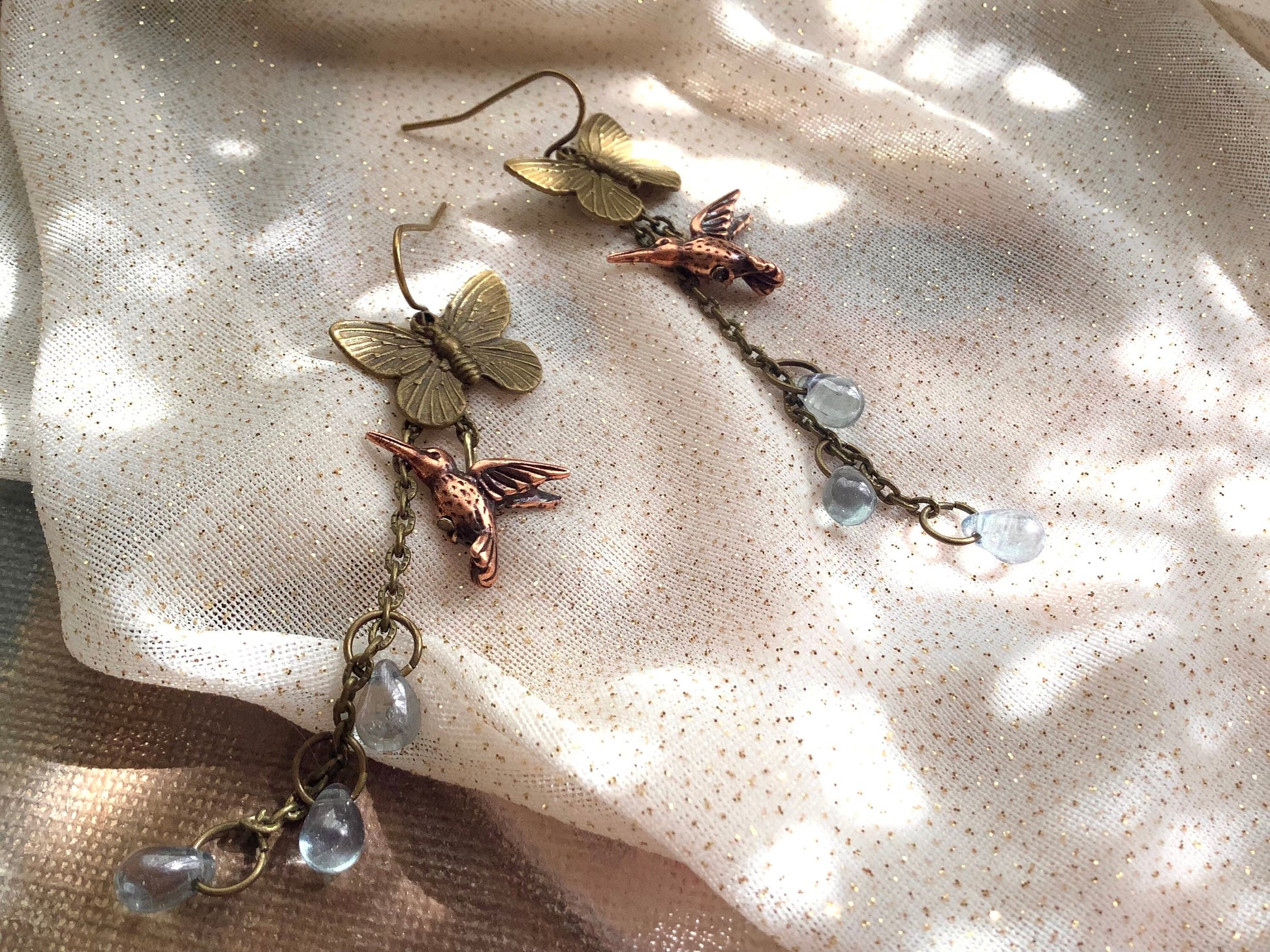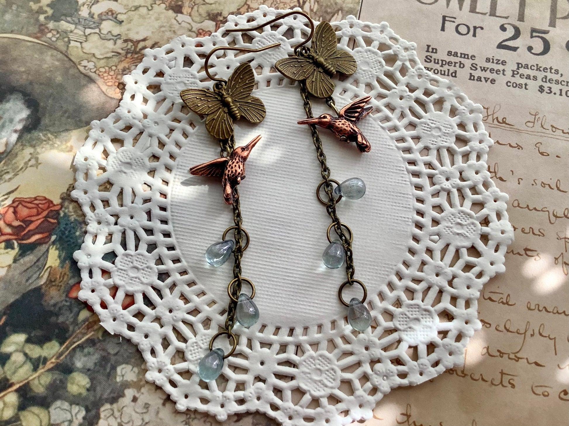 Hummingbird, butterfly, and dewdrop earrings, fanciful fairytale earrings, vintage style earrings