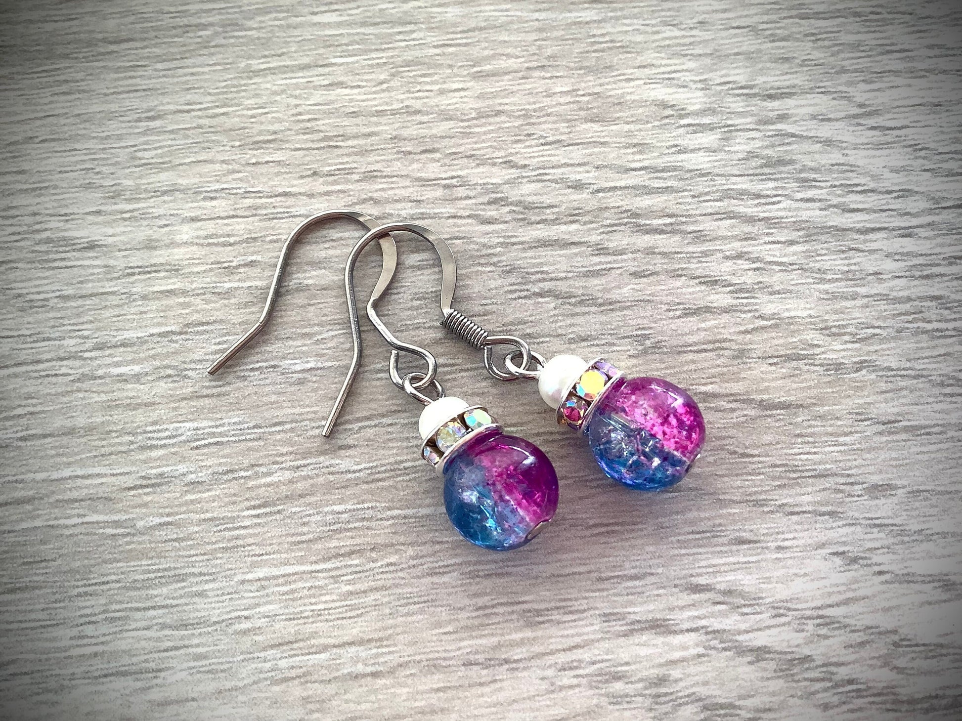 Magenta Blue Crackle Glass Colorful Ball Drop Earrings with Stainless Steel Hooks, Mystical, Magical Earrings