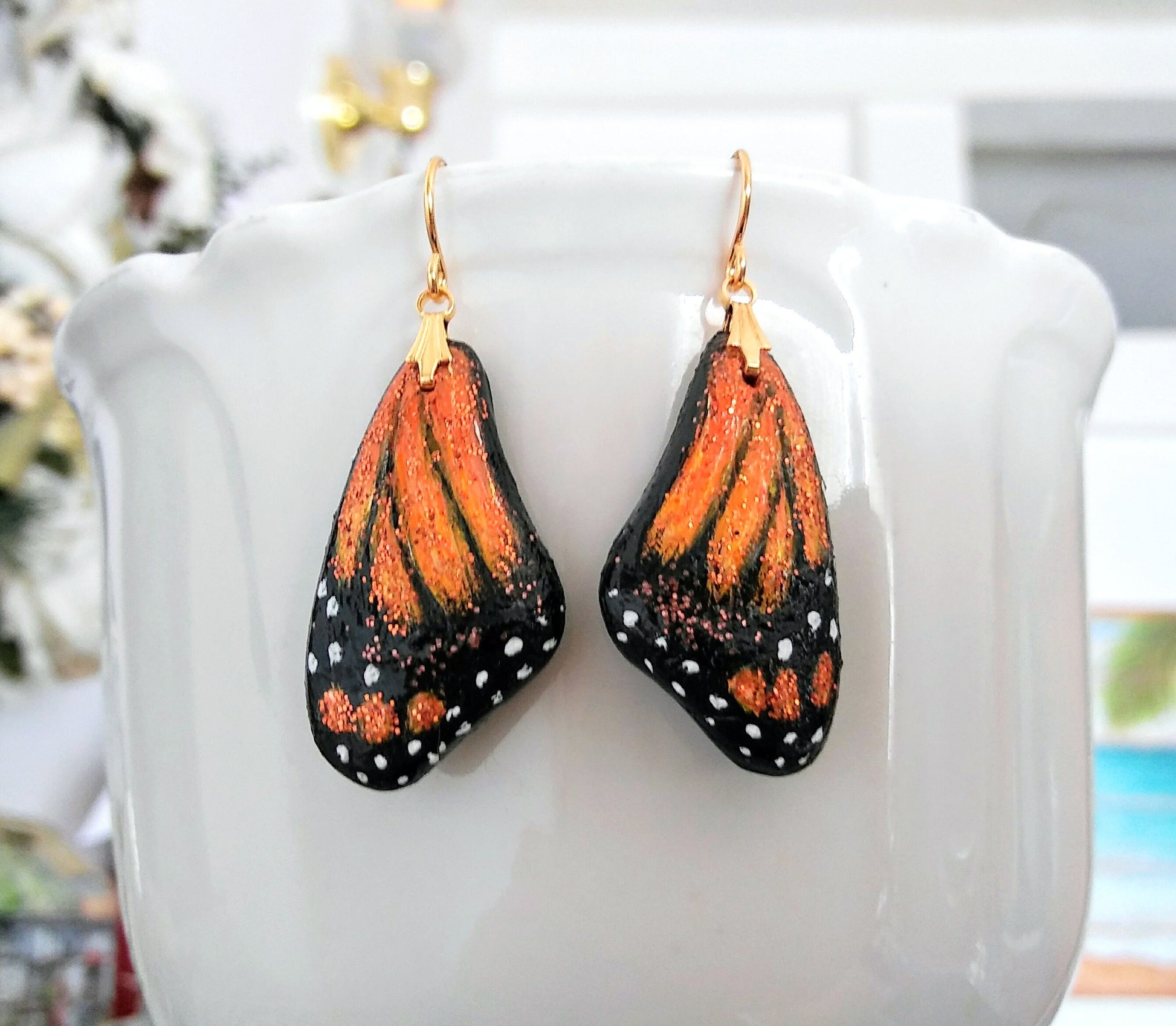 Hand made and hand-painted polymer Monarch butterfly wing earrings are dusted in glitter and hang from gold plated stainless steel ear wires. Backs of wings are painted solid black with black and brown dusting glitter delicately applied.