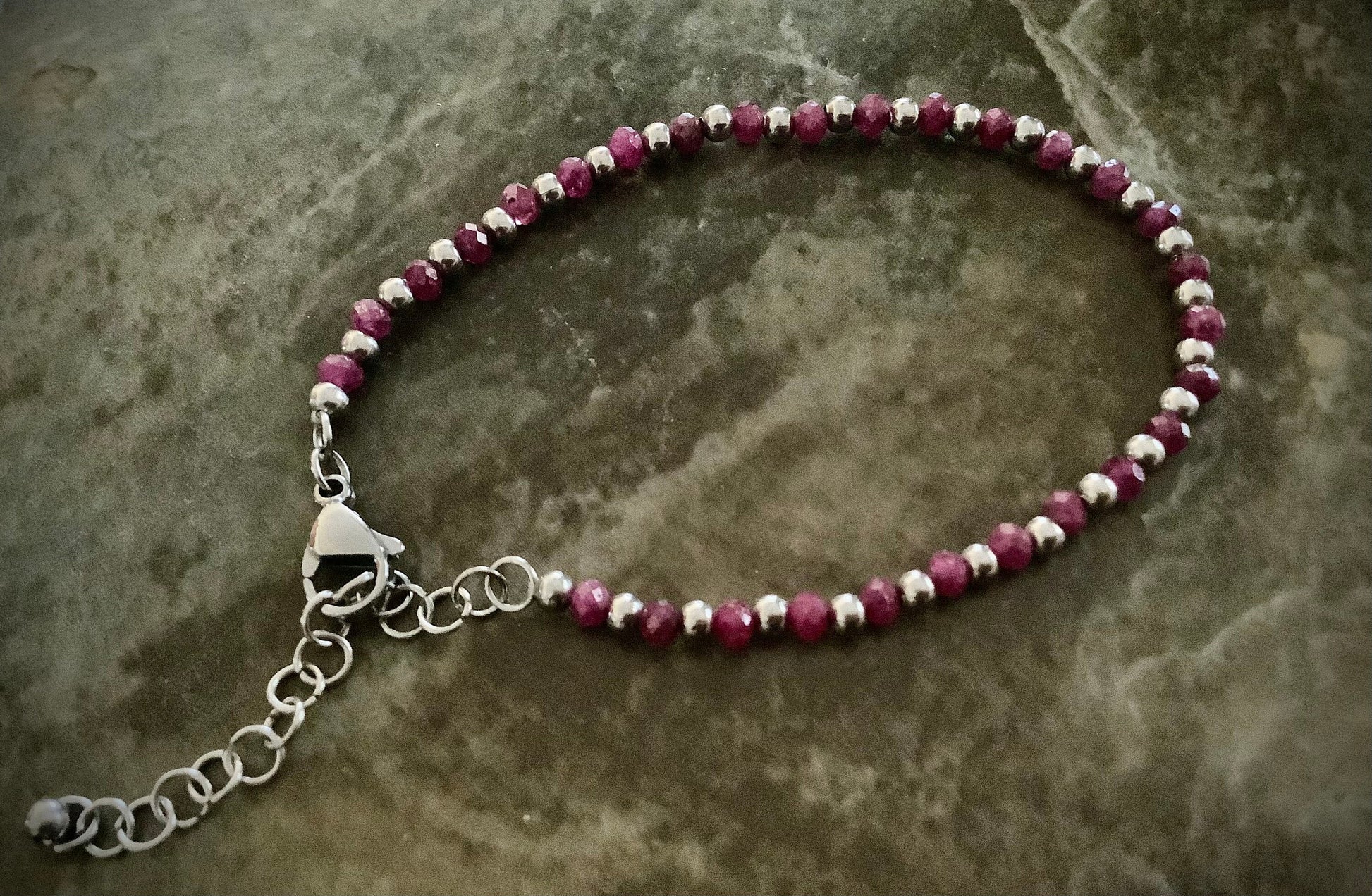 Genuine natural untreated Ruby bracelet. The perfect lightweight bracelet that boasts the perfect pop of delicate soft fuchsia pink to your wrist. Handcrafted with natural faceted 2-3mm Ruby gemstones, featuring stainless steel beads, extender chain, and closure.