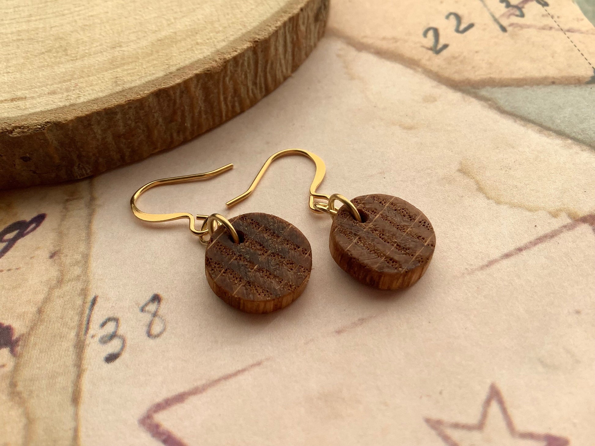 Oak wood slice disk earrings, natural earrings, boho, hippie, wooden earrings, minimalist earrings, Tiny round, small coin style, warm look