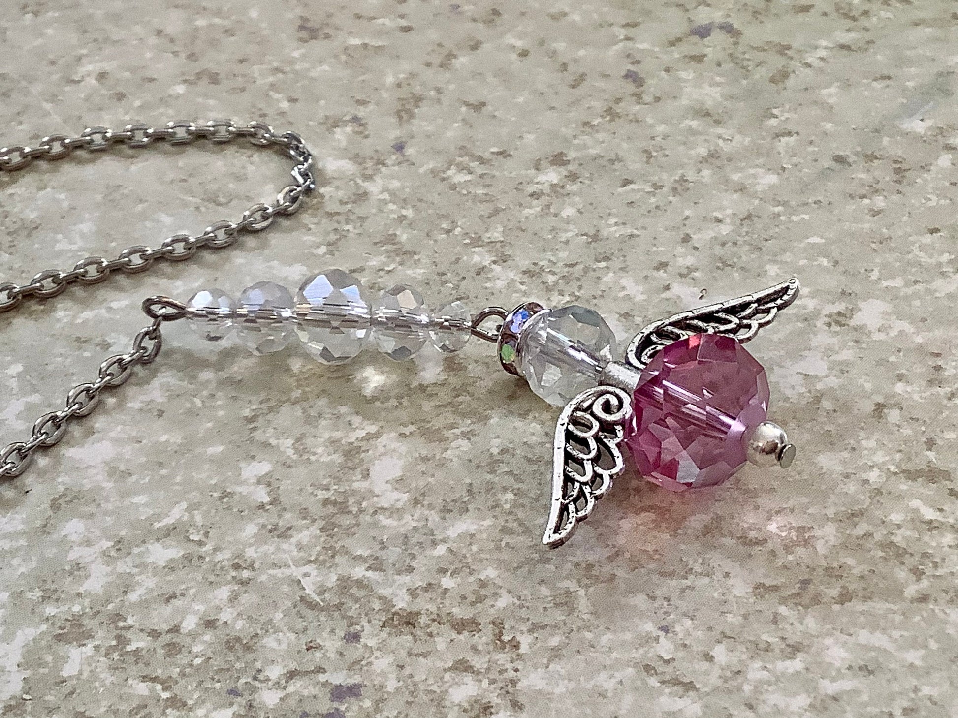 Light plum violet with pinkish hues crystal angel with glass crystal beads and sparkling silver-tone components. Handmade with much love in the USA Chain with clasp.