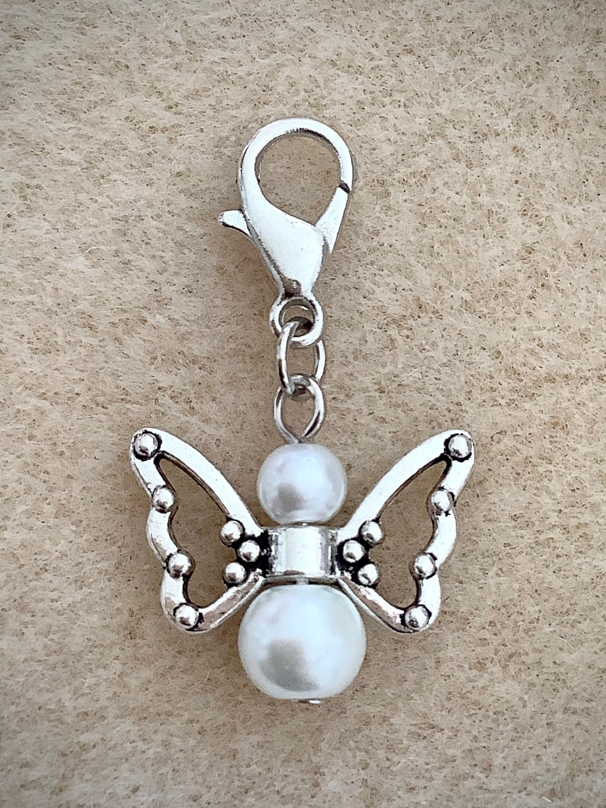 Sweet tiny handmade butterfly angel clip on charms lovingly created with glass pearl beads, Tibetan silver angel wing spacer beads and affixed to a silver-tone metal lobster clasps. The entire length of each charm is 3 centimeters from the top of the clasp to the bottom of the butterfly angel. Great for attaching to zippers, book bags, purses, keychains, bouquets, dresses, necklaces, bracelets and so much more! Choose your desired quantity at checkout.