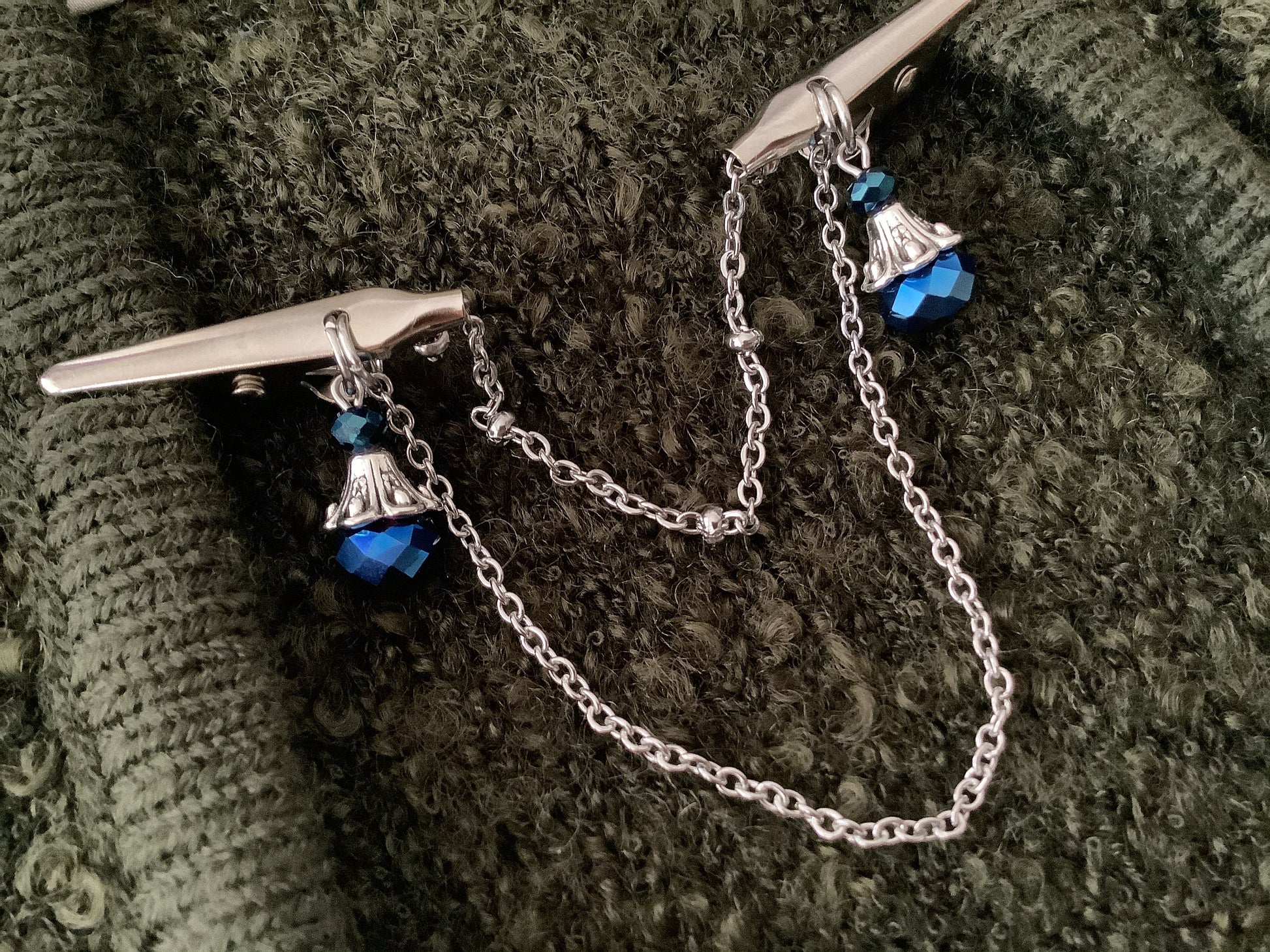 Beautiful sweater or scarf clip made with metal clips, hypoallergenic stainless steel chains, Tibetan Silver trumpet flower findings and blue metallic crystals.