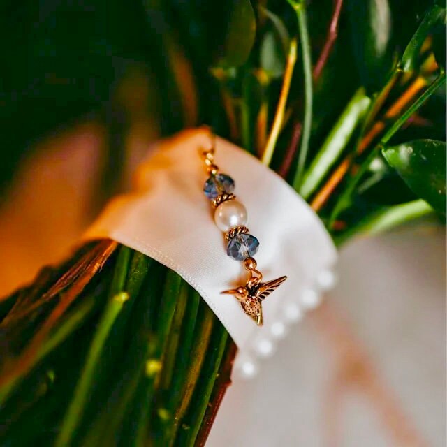 Tiny hand-beaded sparkling blue glass crystal beads with a warm colored glass pearl compliment your choice of hummingbird, butterfly or gold angel/bee charm.