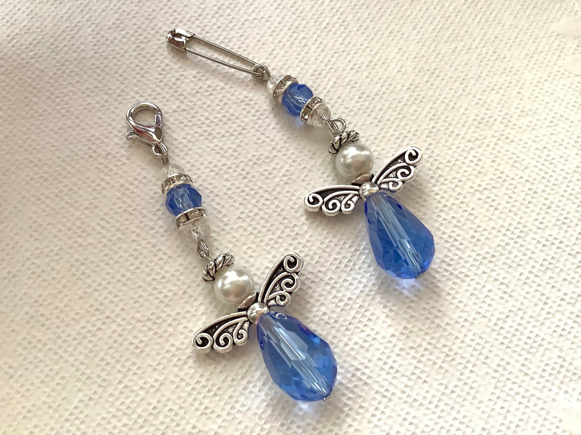 This sweet handmade angel is comprised of a beautiful blue glass teardrop crystal bead, Tibetan silver wings and crown, metal and glass components, and a shimmering glass pearl. Each tiny sparkling angel is affixed to a small silver-tone brass safety pin or silver tone clasp for easy attachment to whatever she wishes.
