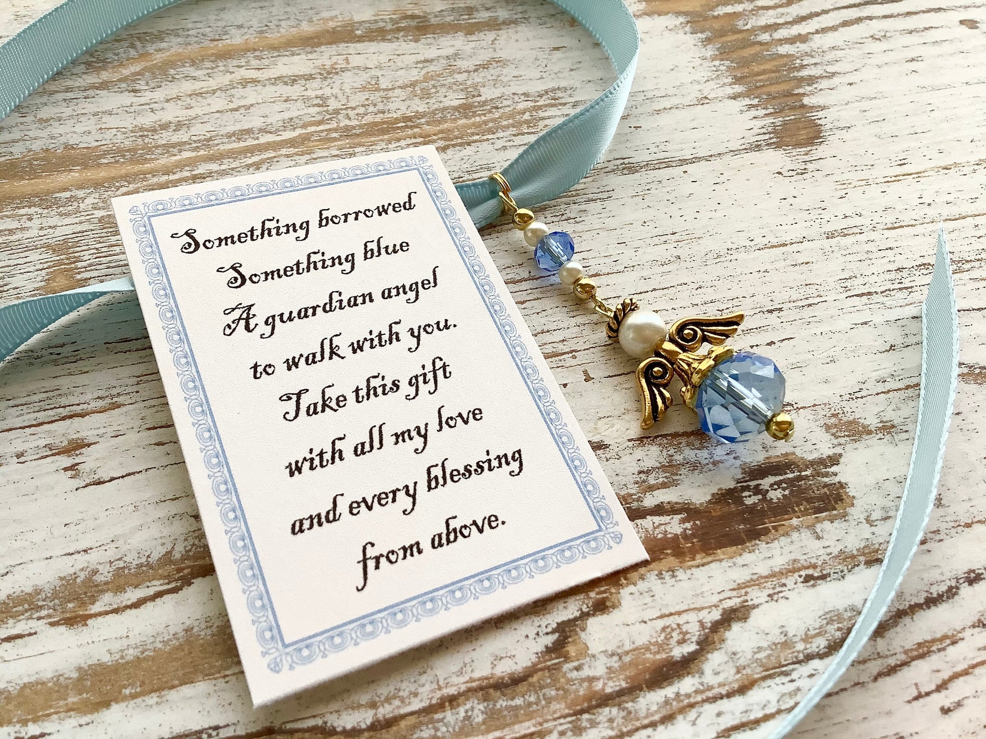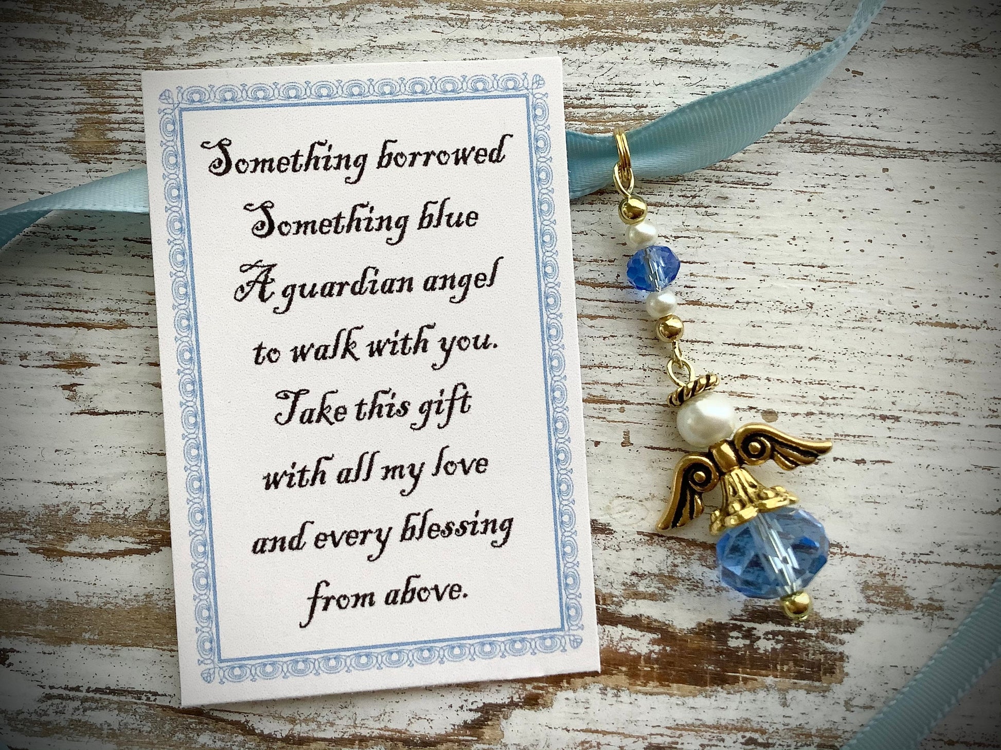 Something Borrowed Something Blue Glass Wedding Bouquet Angel w/Card Wedding Dress Angel, Guardian Angel Bridal Shower, Angel on Blue Ribbon