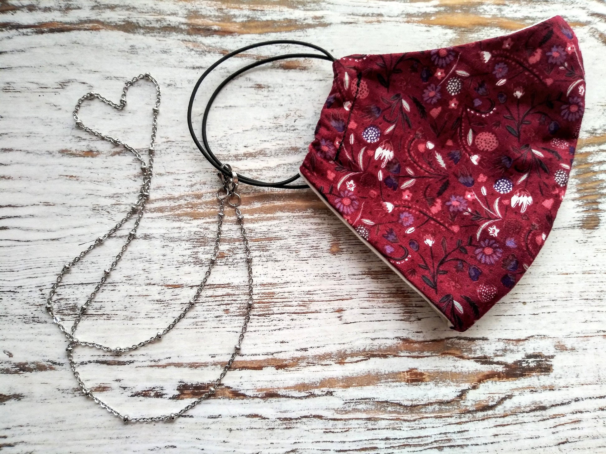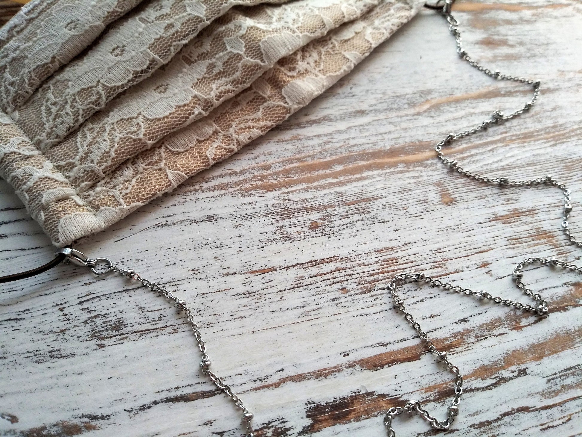 Stainless steel anti tarnish face mask chain. Lightweight and very strong simple mask holder chain with tiny lobster clasps for masks with thin elastic or cord bands as shown.