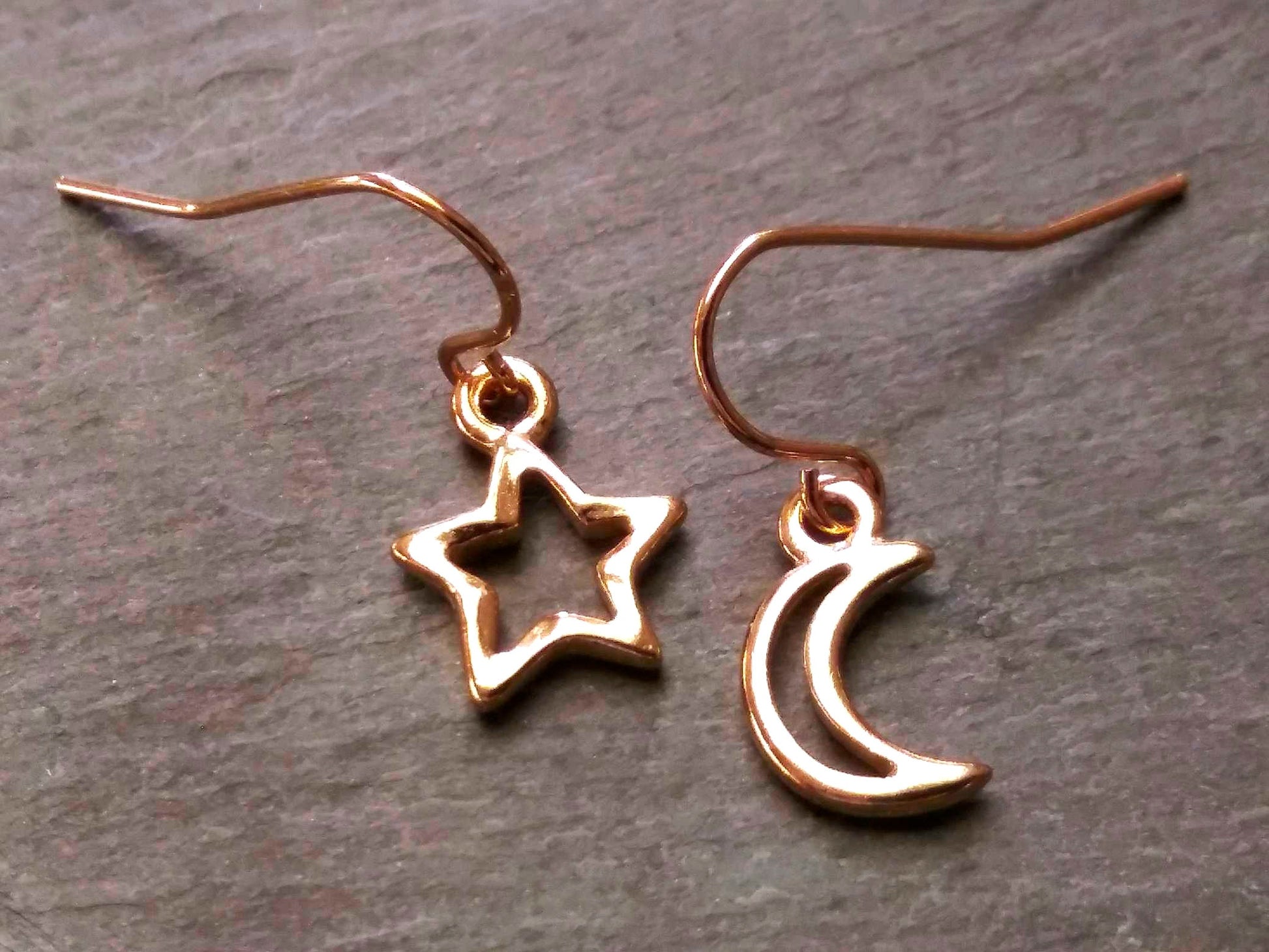 Star and Moon Earrings, Celestial Open 22kt Gold Plated Cadmium & Lead Free Pewter Charms with Gold Plated Steel Ear-wires, Minimalist, Tiny
