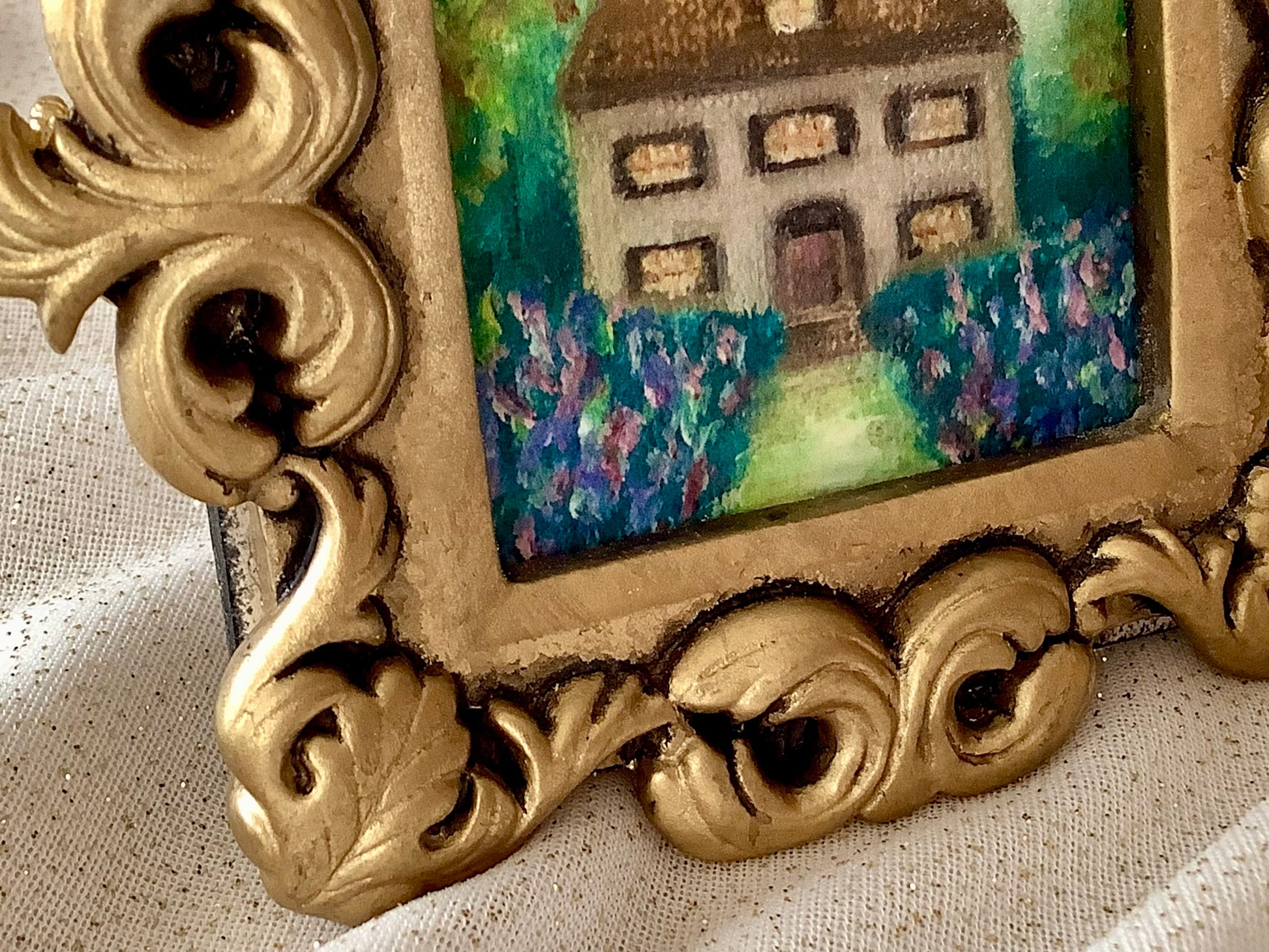 Vintage cottage garden art in charming ornate gold baroque style frame miniature art