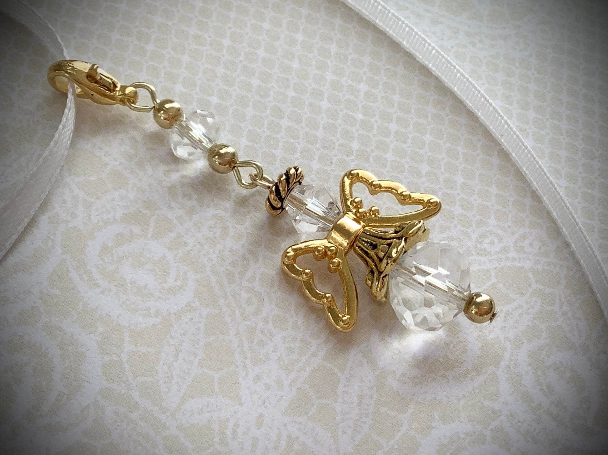 This sweet handmade angel is comprised of beautiful glass crystal beads, gold plated wings and crown plus gold tone components. Each tiny sparkling angel is affixed to a 20 inch thin white satin ribbon to tie around the trunk of the bride’s bouquet 💐 or fasten to your car’s rear view mirror and more!