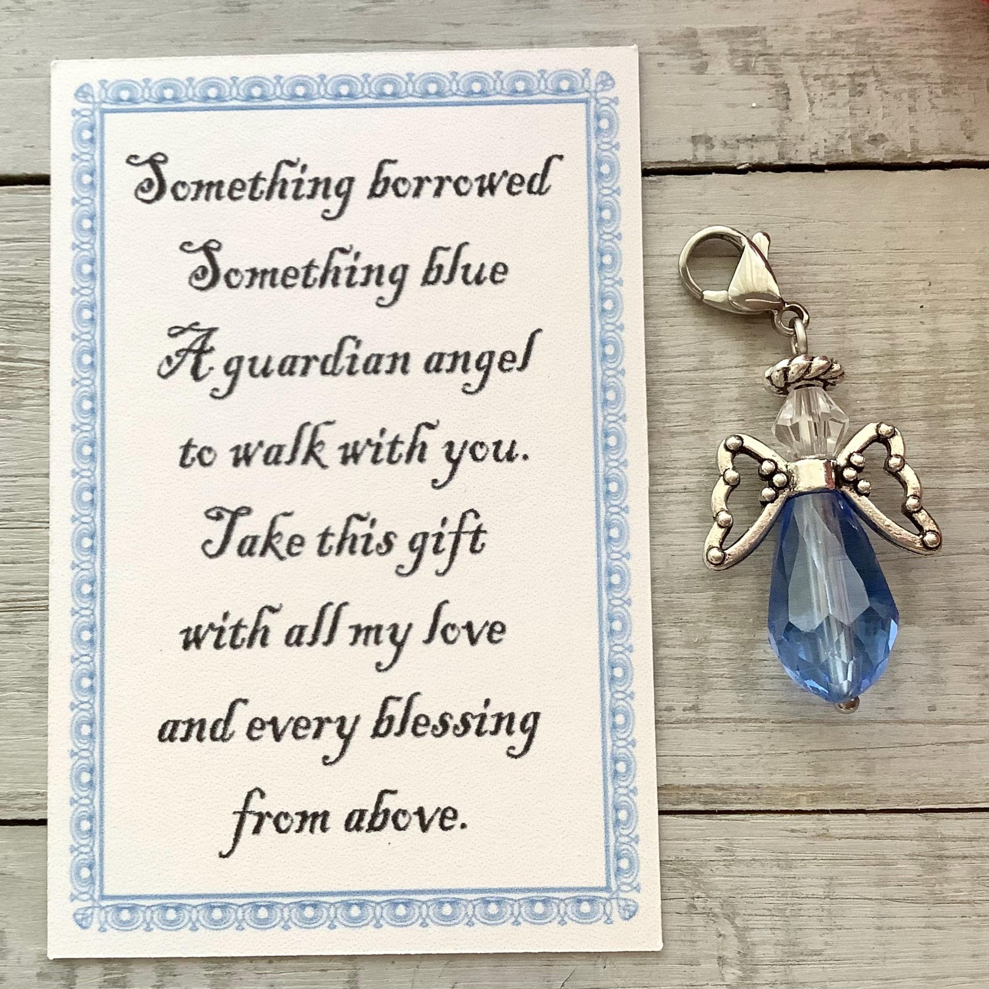 Something blue bridal bouquet charms, garter charms. Handmade with much love and care. A meaningful gift to be treasured for the bride on her wedding day. Tiny hand-beaded sparkling blue glass angel for bridal bouquets, wedding dresses, garters, and more!