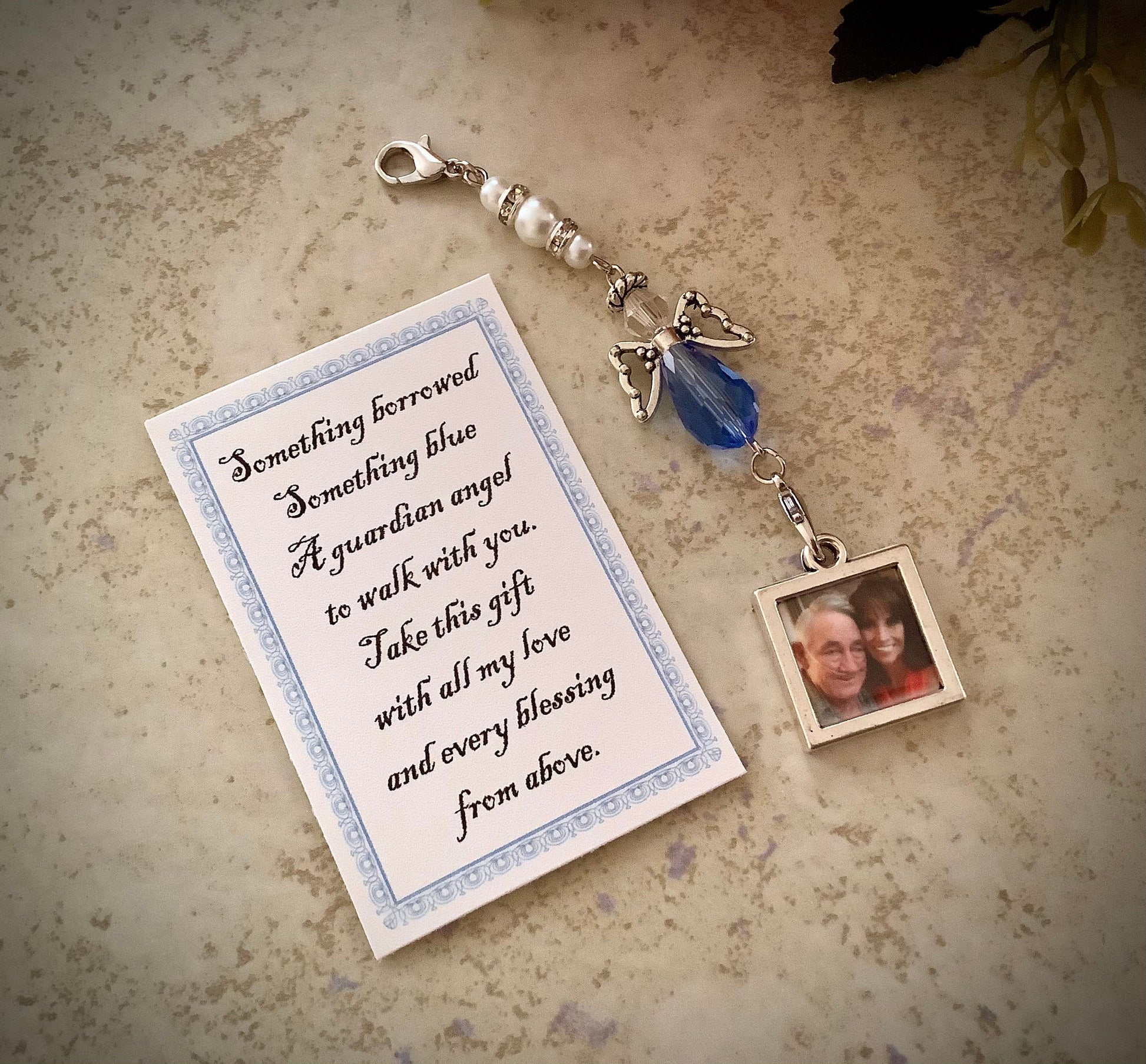 Wedding Bouquet Photo Charm, Something Blue Wedding Bouquet Angel w/Card Wedding Dress Angel, Guardian Angel Bridal Shower Gift, Bride Gift